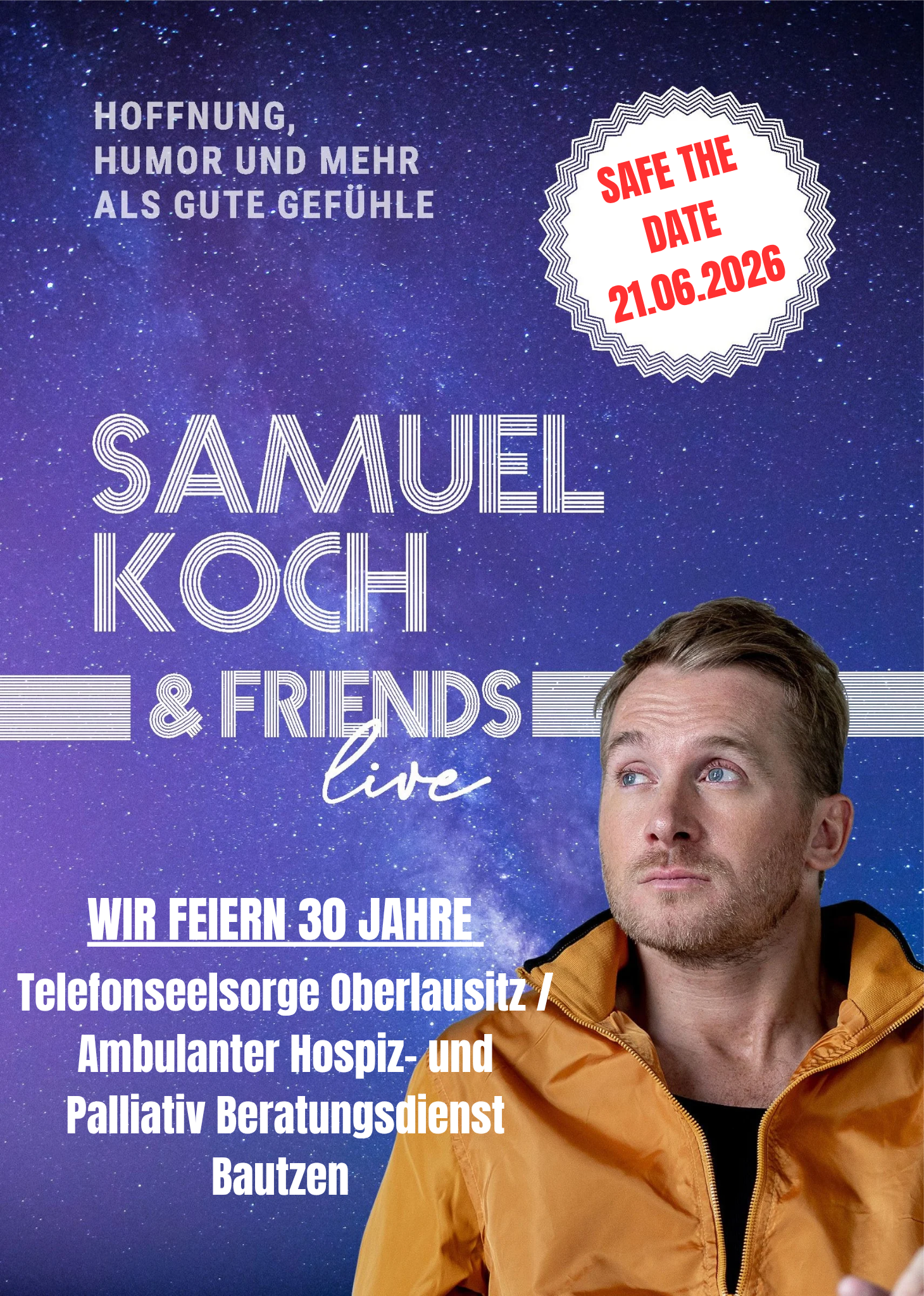 Im Rahmen des Jubiläums wird unser Gast Samuel Koch über Resilienz, mentale Stärke und die Kraft der Hoffnung in Krisenzeiten sprechen. Ausgehend von seinem eigenen Lebensweg zeigt er, wie es gelingen kann, selbst in scheinbar ausweglosen Situationen neue Perspektiven zu entwickeln. Musikalische Beiträge rahmen den Vortrag ein und verleihen dem Nachmittag eine besondere Atmosphäre.